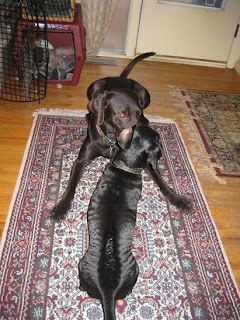 While Sophie and Maggie's attempts at bonding with Hank have been tentative, Rachsie has had no reservations. Or perhaps she wishes to assert herself as the alpha dog. Hank frequently gets a belly rub from August in the mornings after breakfast. On this particular morning Rachsie decided hers should be the belly rubbed and since she wasn't big enough to unseat Hank she just lounged on top of him!